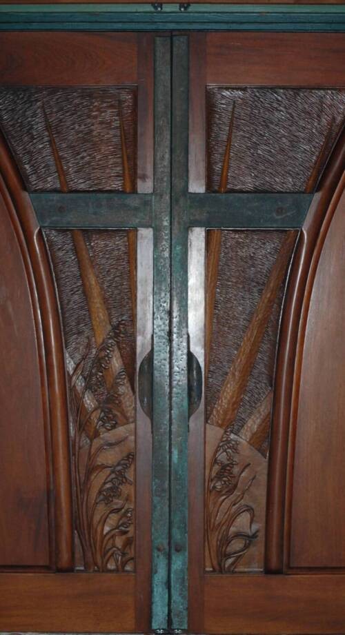 The doors, beautifully hand carved by master craftsman and artist, George Randolph of Mount Dora, Florida, depict the light of the first resurrection morning. It is through the light of this dawning that we find salvation through Christ’s sacrifice, and only through our faith and belief are we to gain the light of everlasting life. The sea oats symbolize that through death we attain new and eternal life.