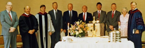 The almost-completed building was filled to over-flowing for the first service on July 29, 1990. The formal dedication of the Chapel was held on October 28, 1989. The final cost of the project was $1.3 million. The construction loan was fully satisfied in March of 1992. The new building had many striking features. The hand-carved entry doors created by artist George Pandolph welcome arriving worshippers. The large beveled glass cross in the Chancel, designed and installed by monks from the Monastery of the Holy Spirit in Conyers, Georgia, was the focal point upon entering. This cross, combined with its clear glass side panels and the clear windows down each side of the sanctuary welcomed the outside beauty of nature into the inside beauty of the Chapel.