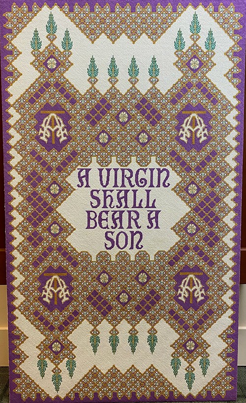 The major symbols used in the Advent banner are a scroll, the Messianic Rose, and the Alpha and Omega monogram. The scroll proclaims the prophecy from Isaiah that “a virgin will bear a son.” The Messiah is depicted in the Old Testament as a rose. In the New Testament He is seen as Alpha and Omega, the beginning and the end. Purple is the predominant color of this banner.