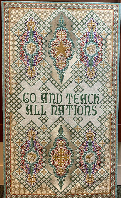 The five-pointed star is the symbol of Epiphany when Christ was made manifest to the Gentiles by the guiding of the Star. In Numbers 24:17 we read, “There shall come a star out of Jacob, and a scepter shall rise out of Israel. . .” Isaiah 60:3 says, “And the Gentiles shall come to the brightness of thy rising.” The Gospel, or the Good News, of the Savior is depicted by the symbols of a winged man for Matthew, a winged lion for Mark, a winged ox for Luke, and an eagle for John. This banner reminds us of the Great Commission which instructs Christians to “go and teach all nations.”