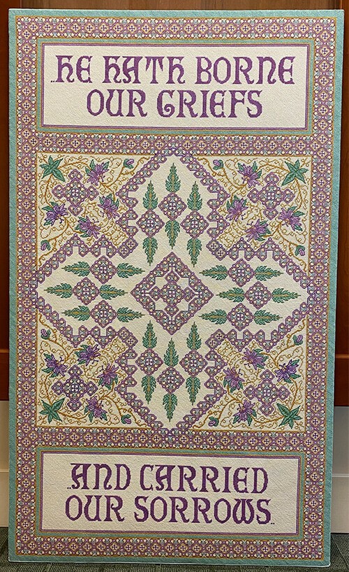 The Lenten Banner depicts Christ’s suffering and sacrifice. The Cross and all it represents is the main symbol. Other symbols of the Passion of Christ are the passion flower, a nimbus, a spear, and the disciples who fled. The Scripture, “He hath borne our griefs and carried our sorrows,” offers hope in the midst of looking backward to his suffering.
