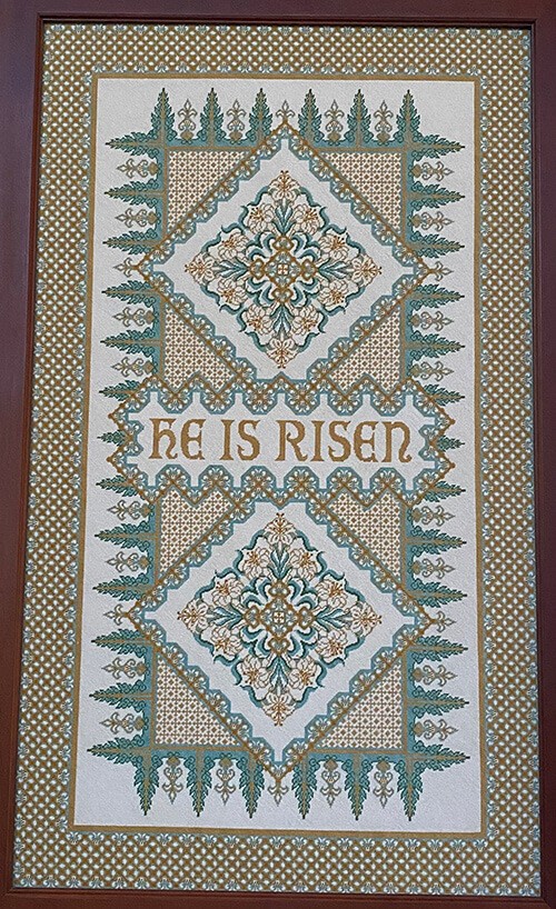 The symbol of the lily is dominant in the Easter banner which celebrates the Resurrection. The Easter lily comes from a bulb which appears to be dead but when planted in the earth it sprouts forth in new life. The Scripture, “He is Risen,” gives hope for the future with the risen Christ.