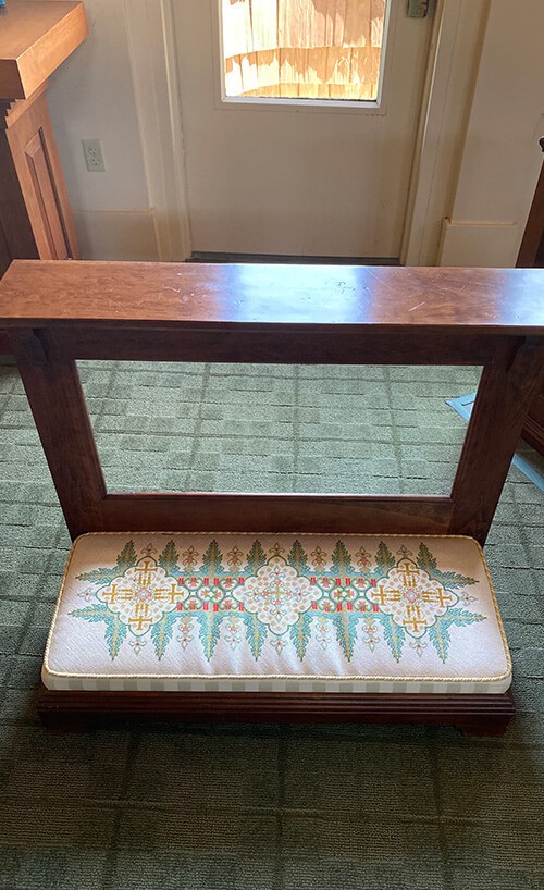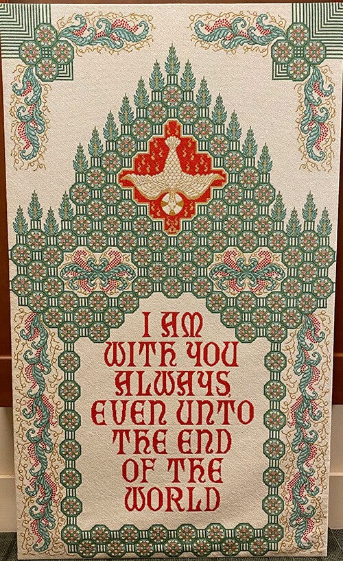 A striking feature of the Chapel is the needlepoint used throughout. Five large banners are displayed showing the seasons of the church year. The four chairs in the Chancel represent elements of The Trinity. A kneeling bench is used for special prayers and at wedding ceremonies. Paraments for the pulpit and lectern were gifts from the designer, Susan Witt of Columbus, Georgia. Fourteen members of the Chapel completed this project within eighteen months. The needlepoint was dedicated in January 2004.