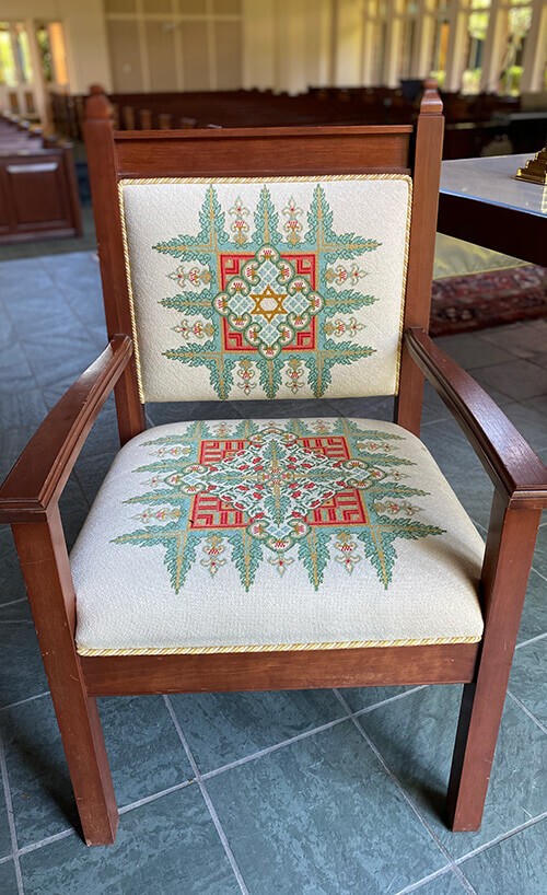 The four chairs in the Chancel of the Chapel represent each of the Persons of the Trinity and the Trinity itself. The chair symbolizing God the Father depicts the Six-Pointed Star. Each point of the star represents an attribute of God. In the seat of God’s chair is the symbol of love, which is the red rose. The symbol for God the Son is the Alpha and Omega monogram, which are the first and last letters of the Greek alphabet, symbolizing that Christ is the beginning and the end. The seat of the chair contains olive branches, the symbol of peace. The dove is the symbol for God the Holy Spirit. The dove is the embodiment of power and life, as is the believer who is empowered by the Holy Spirit. The seat contains grapes, the symbol for the Fruit of the Spirit. The symbol for the Trinity is the fleur-de-lis with its three divisions. The seat design is wheat which represents the harvest of believers. God uses believers in the gathering of the harvest of souls.